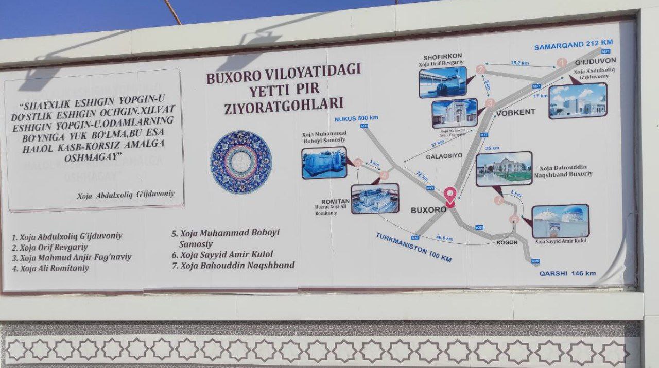 Выезд из отеля на экскурсию в 09:00 утра. Начало Экскурсии по святым Пирам Бухорои Шарифа. Поездка по святым местам: · Гиждуван- место рождения первого святого из семи – АБДУЛХАЛИКА ГИЖДУВАНИ (1103-1179). · Шафиркан – ХАДЖИ АРИФА РИВГАРИ, или святой Хаджа Ариф Мохи тобон. · Вопкентский район село Анжирбог — ХОДЖА МАХМУД АНЖИР ФАГНАВИЙ · Ромитанский район – ХОДЖА АЛИ РОМИТАНИЙ прозвали «Азизон» (почтенный шейх).